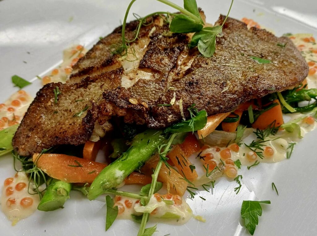 Serveres med kokte poteter, asparges/dine favoritt grønnsaker, Reinhartsen Sandefjordsmør ispedd litt ørretrogn. Eventuelt stekeskyen tilsatt litt nøtter eller Reinhartsen Kipinskisaus